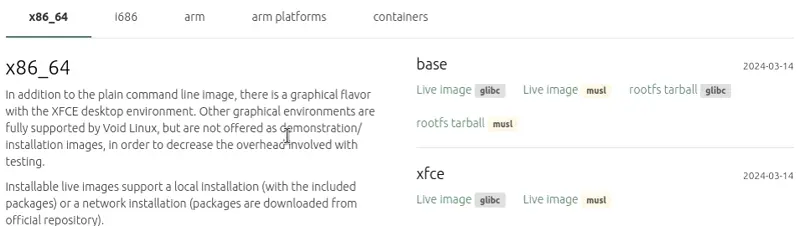 Tu peux télécharger directement l'image du live installer depuis le site web de Void Linux. Pour télécharger celle utilisée dans cet article, il suffit de cliquer sur le lien xfce Live Image musl.