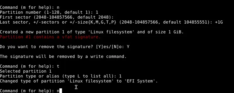 - confirmer la suppression de la signature existante de la partition (Do you want to remove the signature?) en tapant Y