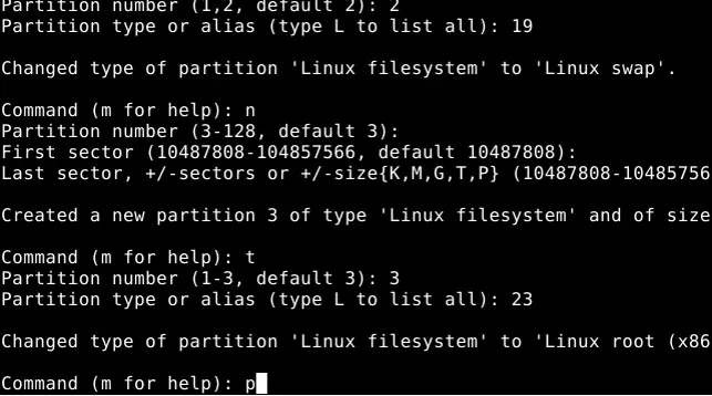 - spécifier le type de partition comme Linux root (x86-64) en tapant 23