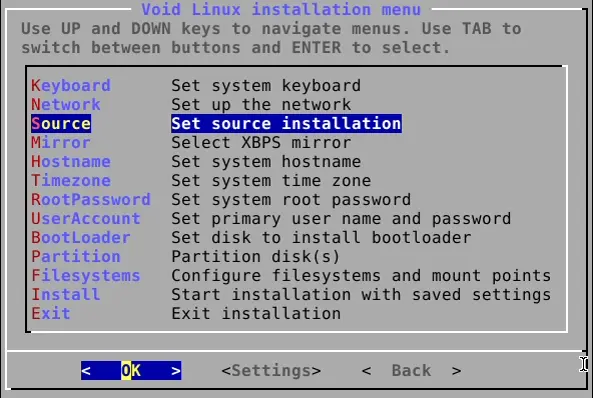 Pour installer Void Linux en utilisant les paquets locaux, tu sélectionnes l'option Source - Set source installation. Puis, tu sélectionne l'option Local Packages from ISO image et tu appuies sur la touche entrée pour valider le choix.