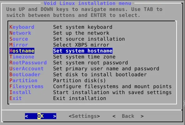 Pour spécifier le nom d'hôte de l'ordinateur, tu dois sélectionner l'option Hostname - Set system hostname. Il te suffit de taper le nom d'hôte et taper entrée pour valider.