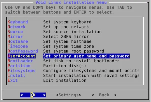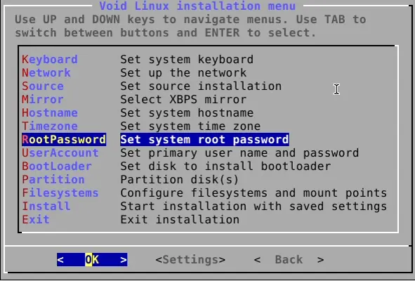 Pour définir le mot de passe de l'utilisateur root, tu vas dans UserAccount - Set primary user name and password. Tu tapes ensuite le mot de passe, puis tu le retape pour le valider.
