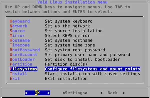 Void Linux, comme toutes les autres distributions Linux, demande à l'utilisateur de découper en partitions le disque dur sur lequel le système sera installé. Chaque partition fonctionne comme s'il s'agissait d'un disque dur autonome, avec son propre système de fichiers, et est indépendante des autres partitions. Les partitions sont stockées dans une table MBR (Master Boot Record) ou dans une table GPT (Globally Unique Identifier Partition Table).