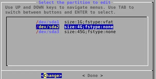 1. Tu sélectionnes la deuxième partition ― dans mon cas, il s'agit de /dev/sda2 ― pour modifier le type de système de fichiers.