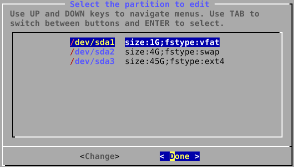 1. Tu dois sélectionner la première partition ― pour moi, il s'agit de la partition /dev/sda1 ― et taper entrée pour changer le système de fichiers et spécifier le point de montage.