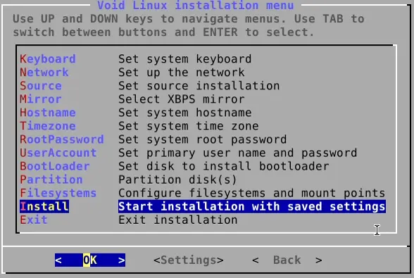 Maintenant que l'installateur a été configuré, il est enfin temps de lancer l'installation de Void Linux. Tu peux lancer l'installation via l'option Install - Start installation with saved settings.
