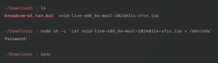 sudo cat sh -c 'void-live-x86_64-musl-20240314-xfce.iso > /dev/sda'